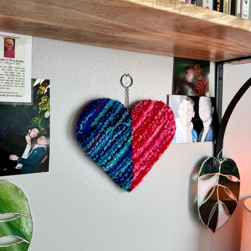 Handmade with acrylic yarn, soft backed with felt and finished with two D rings + chain for multiple easy hanging options.